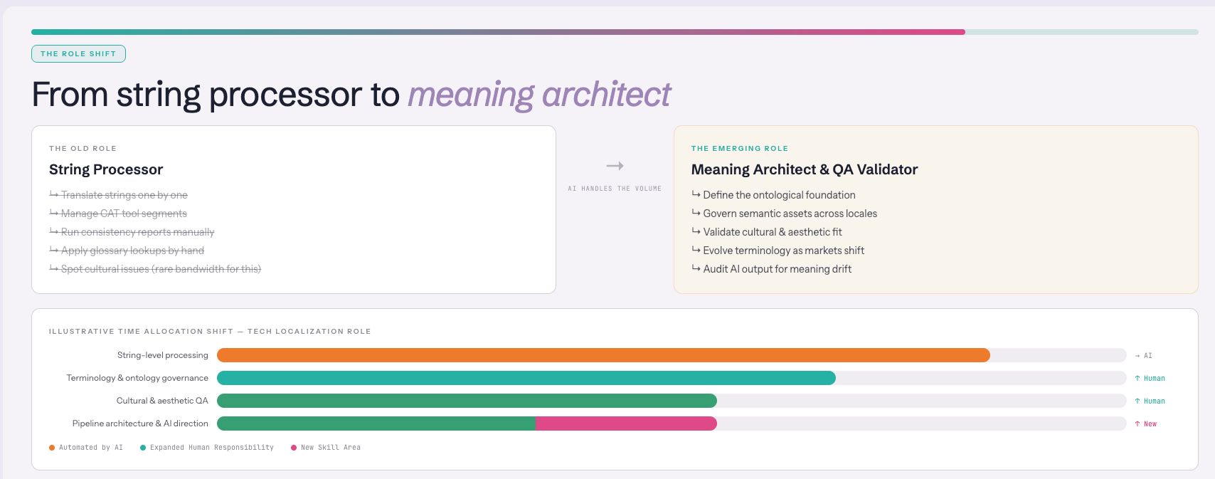 That someone is the linguist. But the job looks more like a meaning architect than a string processor. You’re not translating content — you’re building and maintaining the multilingual ontology that guardrails everything downstream.