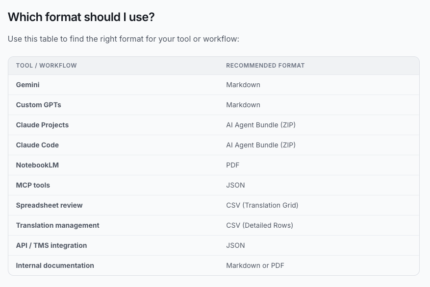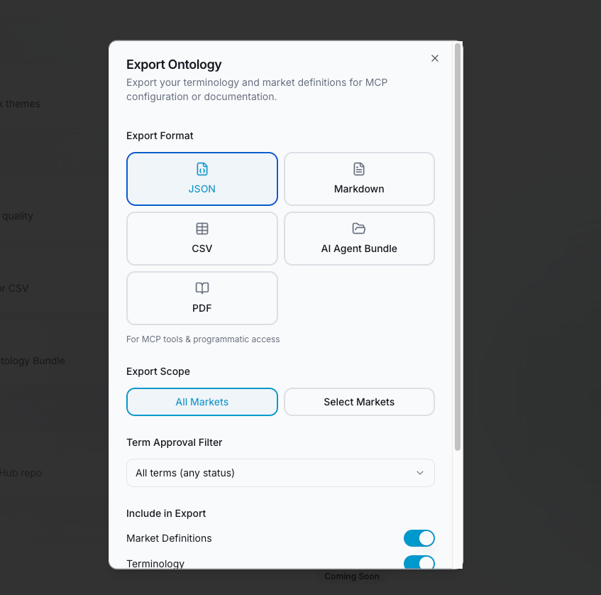 PDF is the newest addition, and the one we’re using here. It produces a fully formatted prose document — concepts organized by class, term tables per locale, market availability summaries, relationship descriptions. The format was built specifically for document-based AI tools.