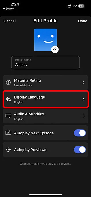 📺 Netflix Mobile App – Uses device language for UI, offers extensive subtitle/audio options per profile.